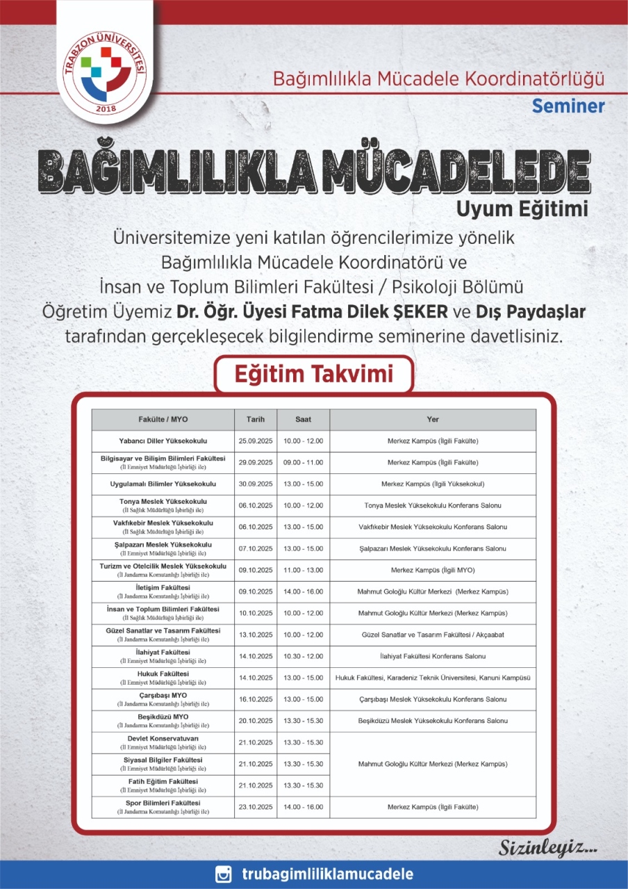 Bağımlılıkla mücadele kapsamında üniversitemiz bünyesinde bulunan Fakülte/Meslek Yüksekokullarımızın örgün eğitimine yeni başlayan öğrencilerine yönelik uyum eğitimi planlanmış olup eğitim takviminde belirtilen gün ve saatte SİZİNLEYİZ...