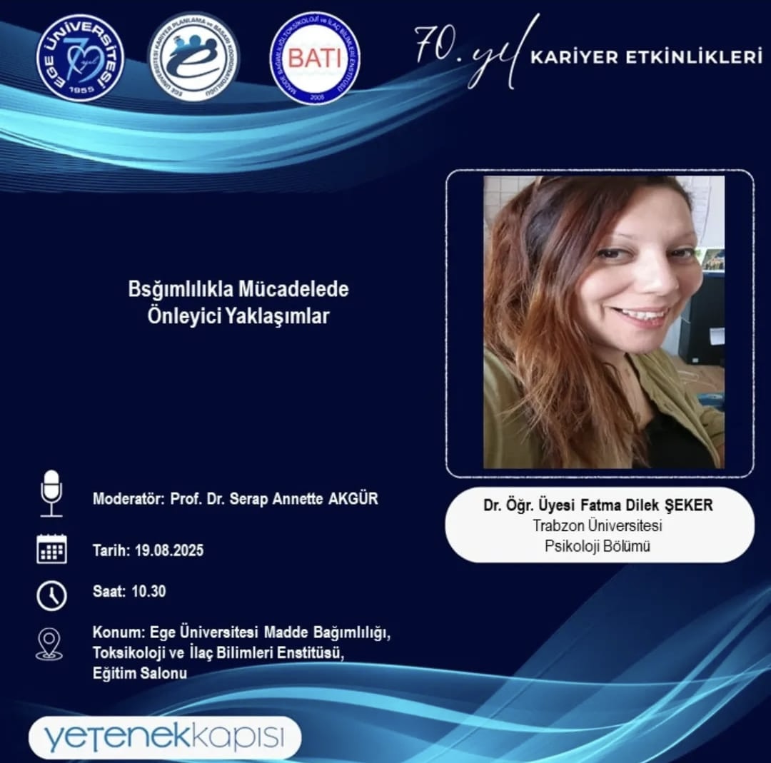 Ege Üniversitesi Madde Bağımlılığı, Toksikoloji ve İlaç Bilimleri Enstitüsü tarafından düzenlenen Kariyer Etkinlikleri kapsamında “Bağımlılıkla Mücadelede Önleyici Yaklaşımlar” başlıklı ders gerçekleştirildi. Derste, bölümümüz Dr. Öğr. Üyesi Fatma Dilek Şeker tarafından bağımlılıkla mücadelede önleme politikalarının bilimsel temelleri ve disiplinlerarası katkılar ele alındı.